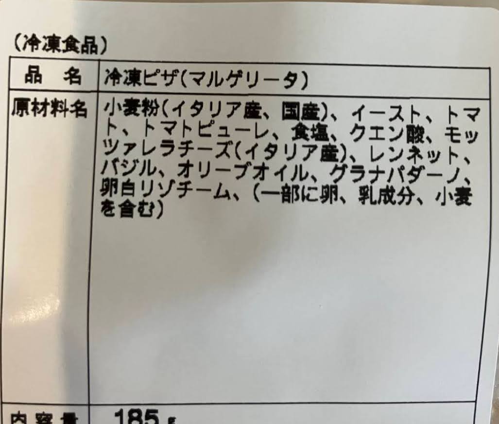 小麦粉(イタリア産、国産)、イースト、トマト、トマトピューレ、食塩、クエン酸、モッツァレラチーズ(イタリア産)、バジル、オリーブオイル、グラナパダーノ、卵白リゾチーム